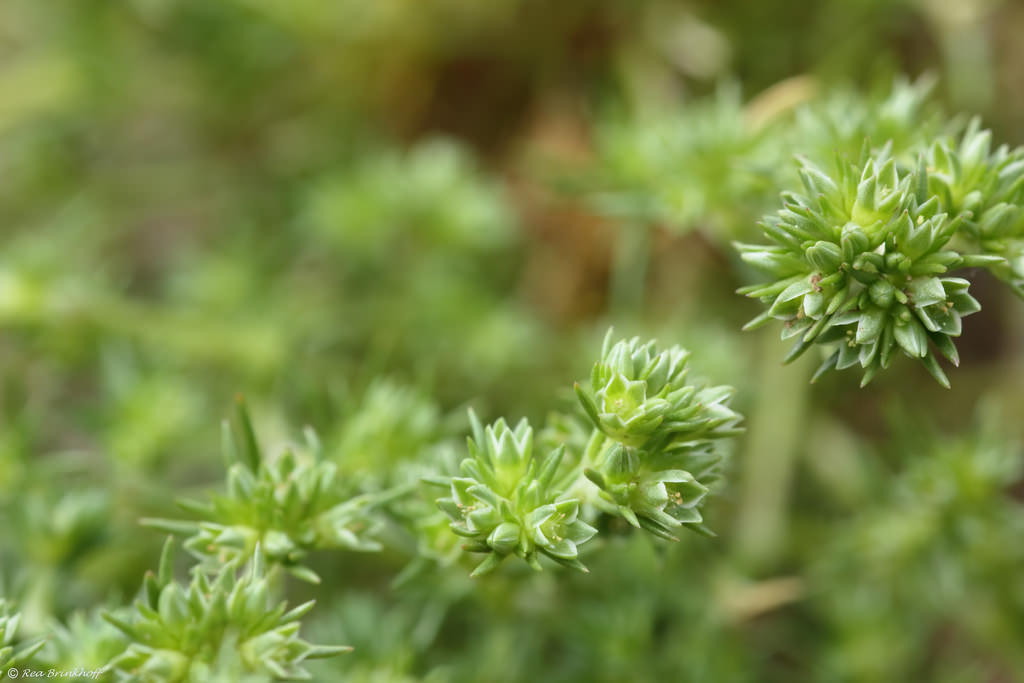 Die kleinen Blüten haben einen Ø von ca. 4mm und bestehen aus 5 grünlichen Kelchblättern. Die spreizenden Kelchzipfel sind gespitzt, gleichlang und haben einen zur Spitze hin schmaler werdenen weißlichen Hautrand.