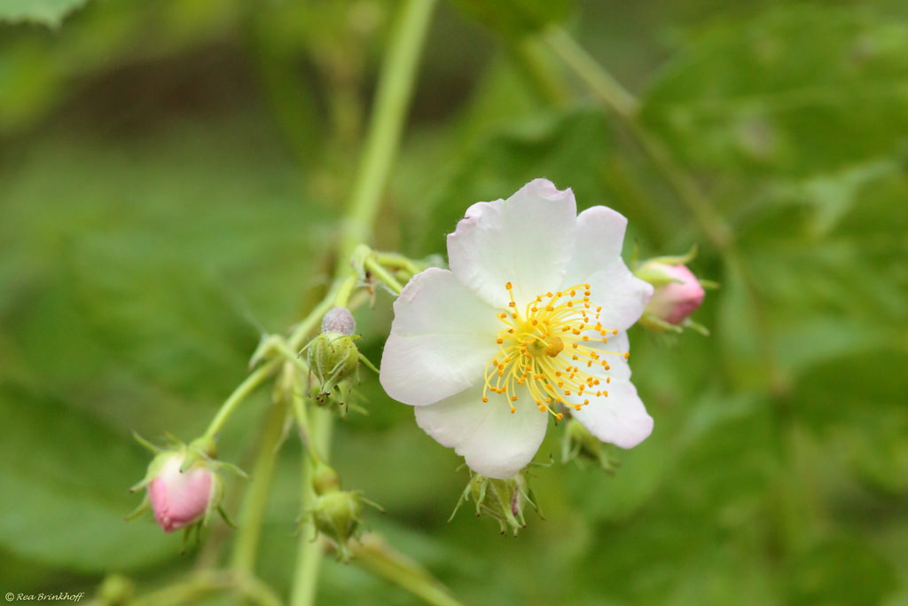 Die Blüten sind weiß oft rosa überhaucht und relativ klein Ø ca. 2cm, der Blütenstand ist aber vielblütig. Mit süßlichen Duft. Eine Rose die keine Ausläufer bildet!