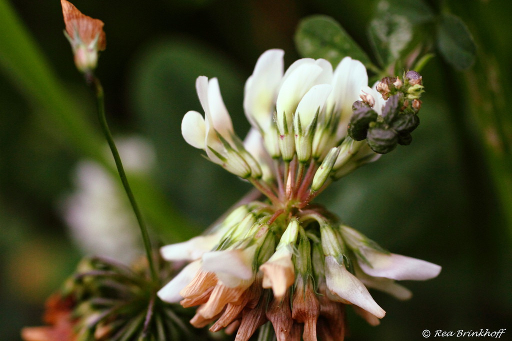 Die Blüten sind weißlich, verblüht bräunlich. Die Blüten sind deutlich gestielt. Dieser Blütenkopf ist ca. 2cm breit.