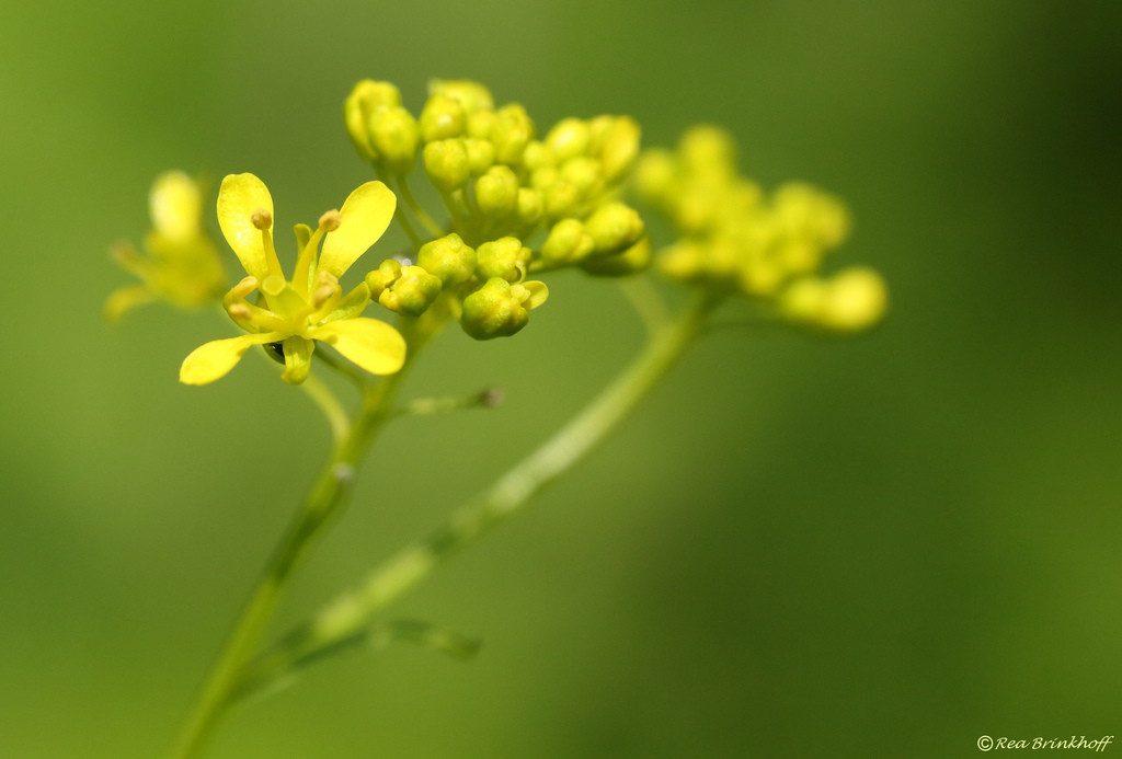 Typisch der trugdoldige Blütenstand. Die Blüten sind gelb, die Kelchblätter gelblich grün, leicht hautrandig und kürzer als die Kronblätter. Gut zu erkennen sind die zum Boden hin verbreiterten Filamente. Ist eine alte Färberpflanze. (Blau)