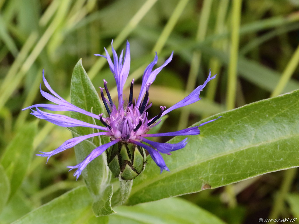 Die Innenblütensind rotviolett die vergrößerten Randblüten eher blau. Die lanzelltichen Blätter sind am Stängel herablaufend etwas derb und rau, unterseits leicht graufilzig.
