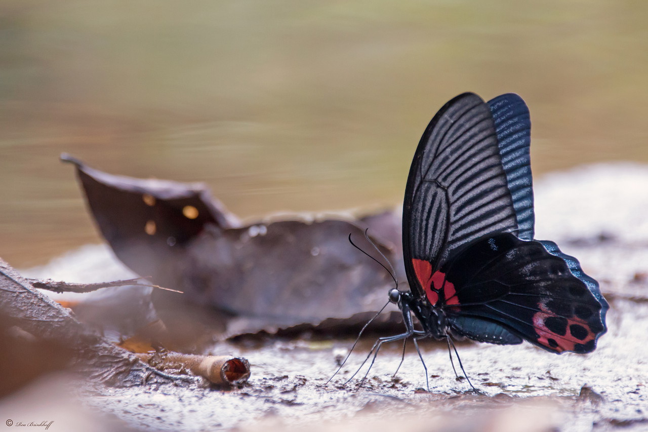 Flügelspannweite ca. 140mm, Grundfarbe schwarz, typisch sind die roten Basalflecken der Vorderflügel, die Hinterflügelunterseite hat ebenfalls eine rote Basis, am Analwinkel auf rotem Grund einige schwarze Flecke, diese reihen sich wie ein Band am Außenrand auch durch die heller bestäubte Zone.